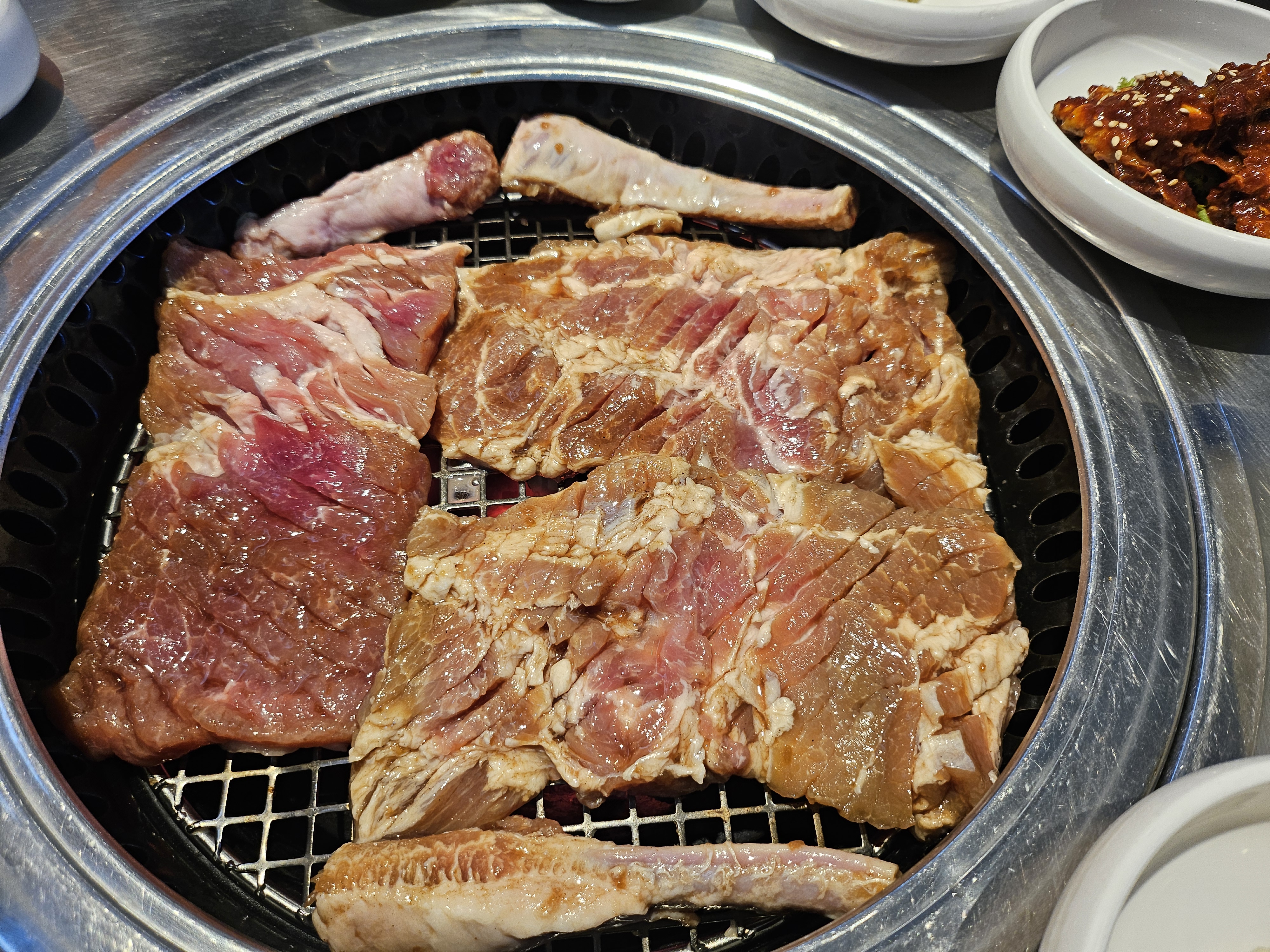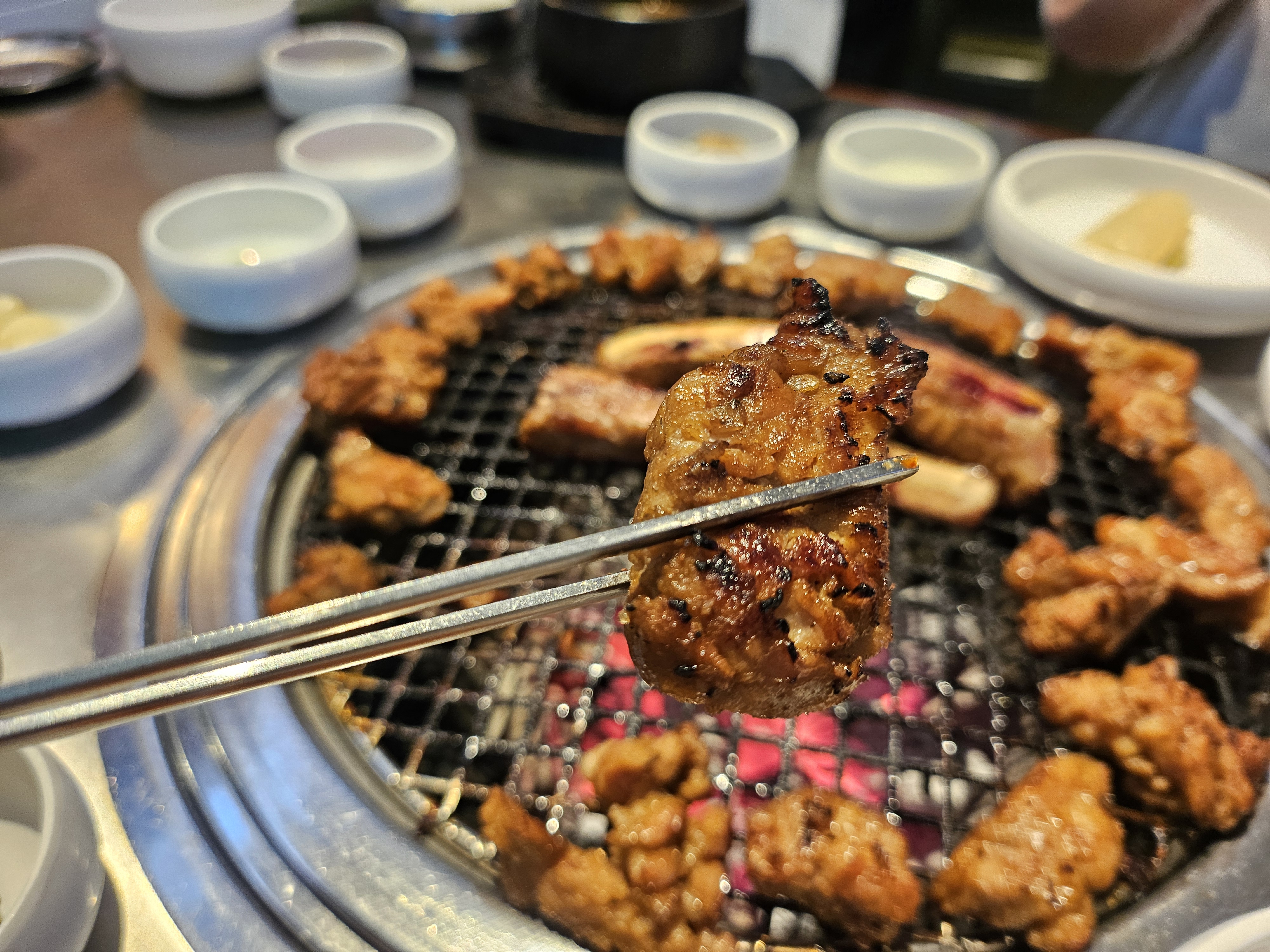 일단 비주얼이 끝내줘요! 숯불 향이 솔솔 올라오는 갈비가 예쁘게 플레이팅되어 나옵니다. 불향 가득한 돼지갈비는 달달하면서도 감칠맛이 뛰어나고, 살코기와 기름기가 적절히 어우러져서 밥도둑이에요.