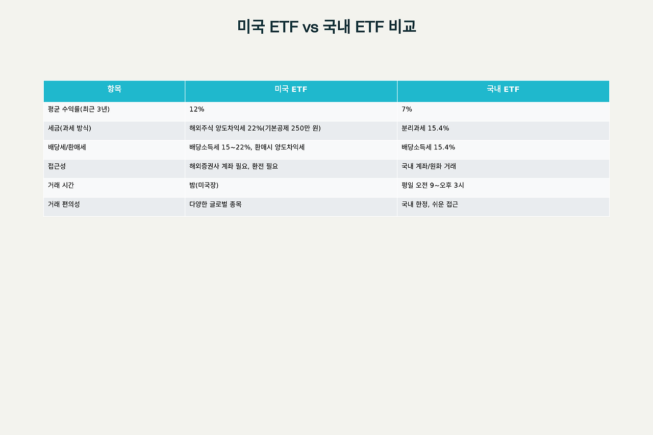 정리하면, 수익률·유동성은 미국 ETF, 세금·편의성은 국내 ETF가 우위에 있다고 할 수 있습니다.