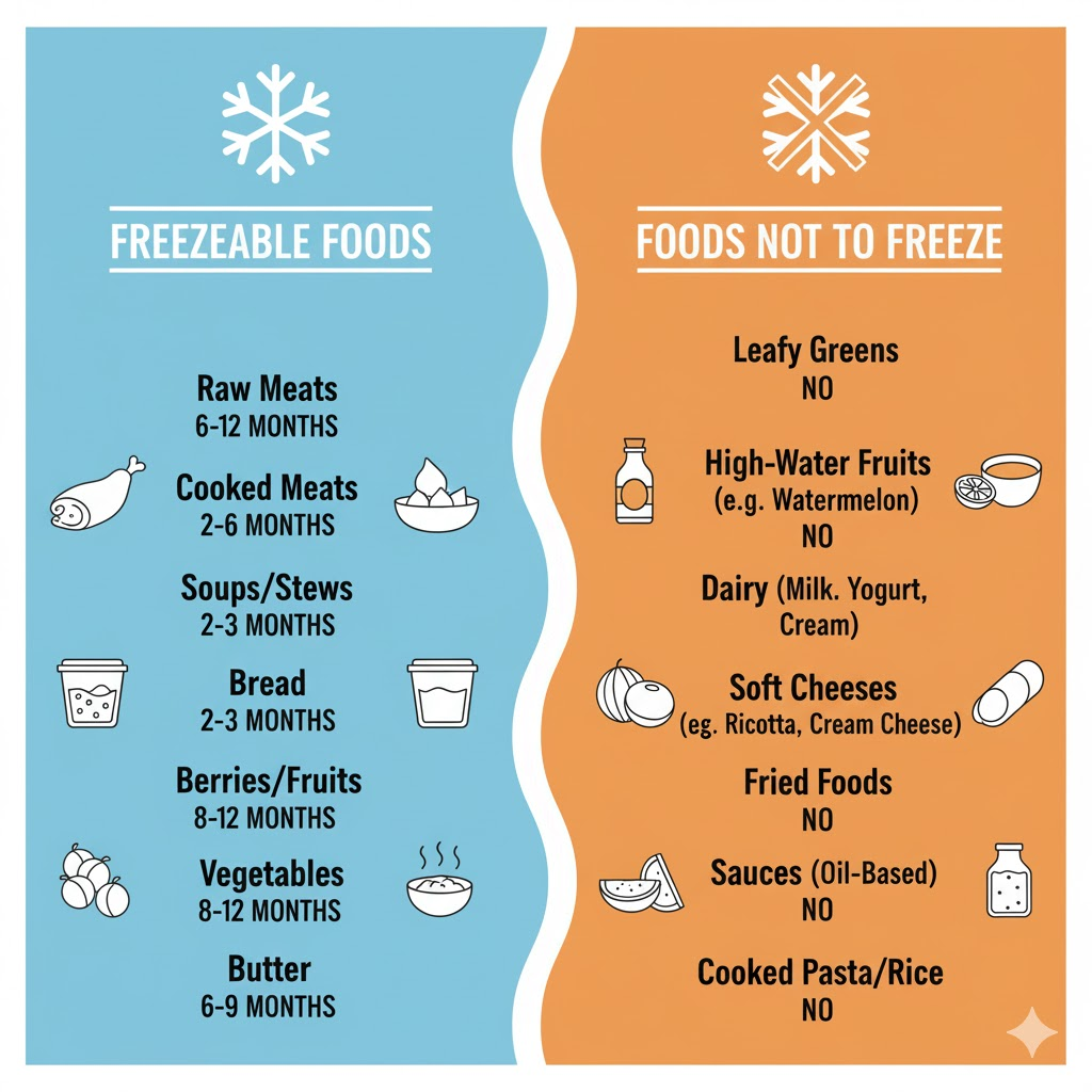 식품의 종류에 따라 냉동 가능한 기간이 다릅니다. 이는 냉동 온도(-18℃ 이하 유지), 포장 상태, 해동 방법에 따라 달라질 수 있지만, 일반적인 가정 기준에서 다음과 같은 기간이 안전선으로 권장됩니다.