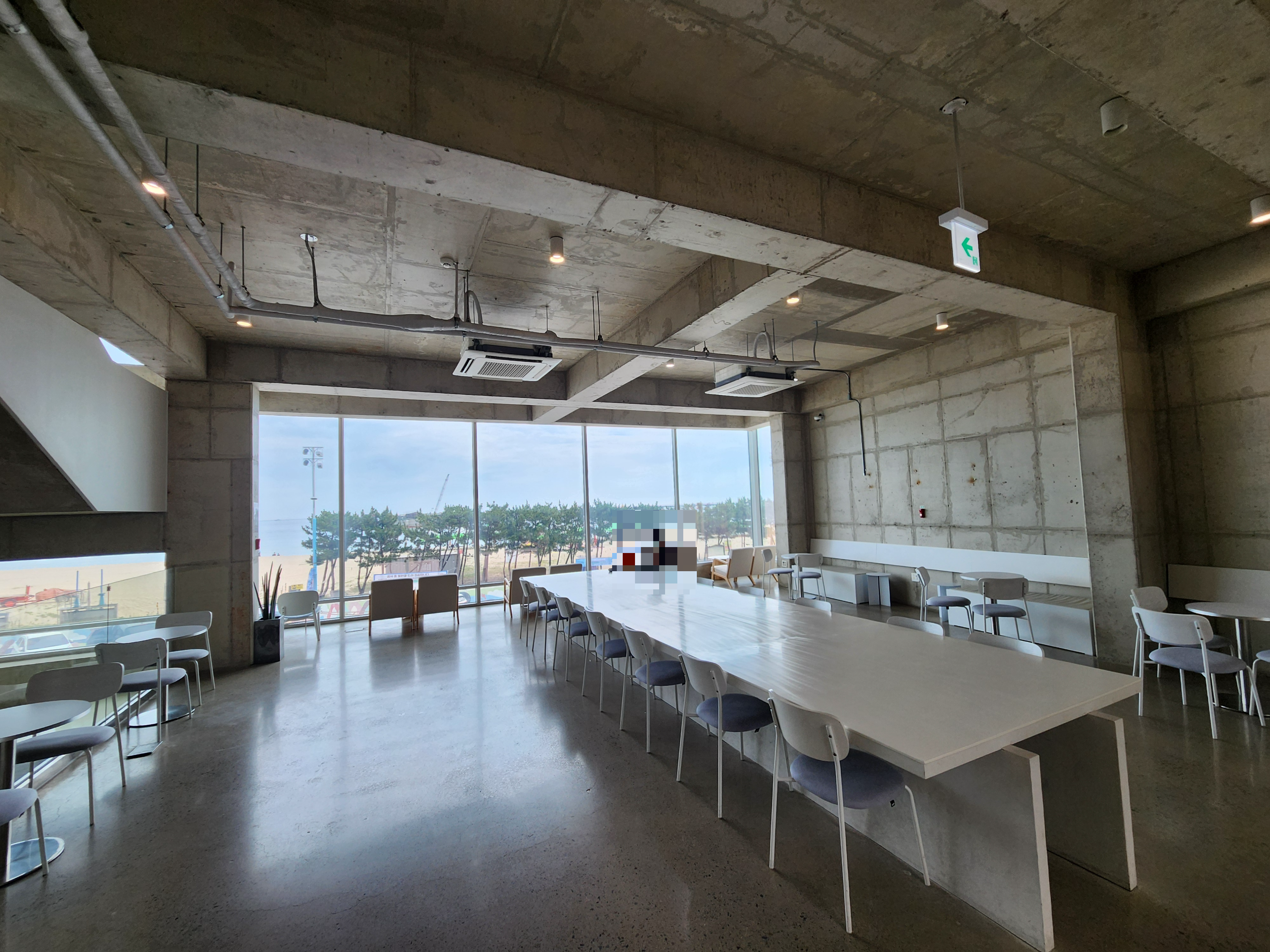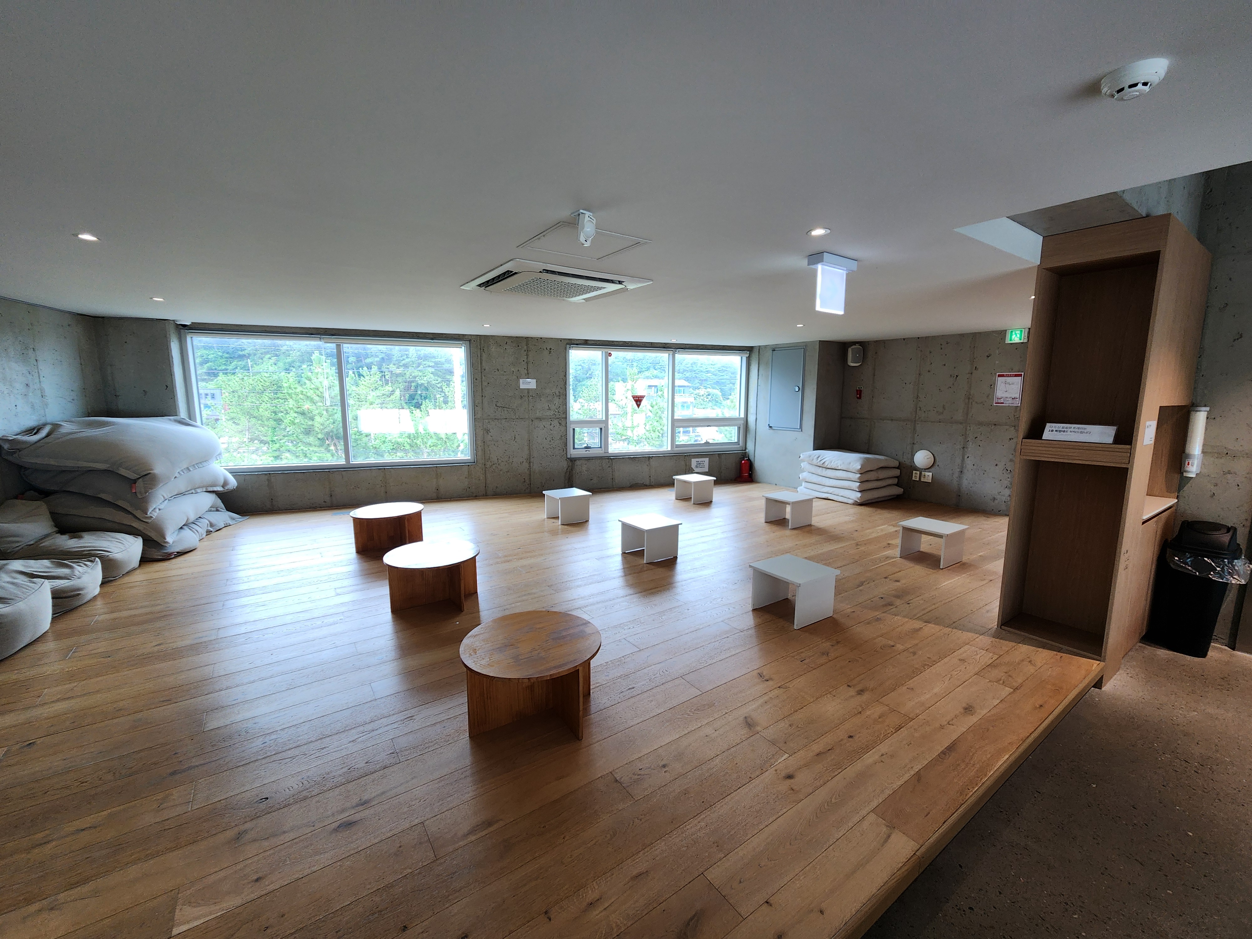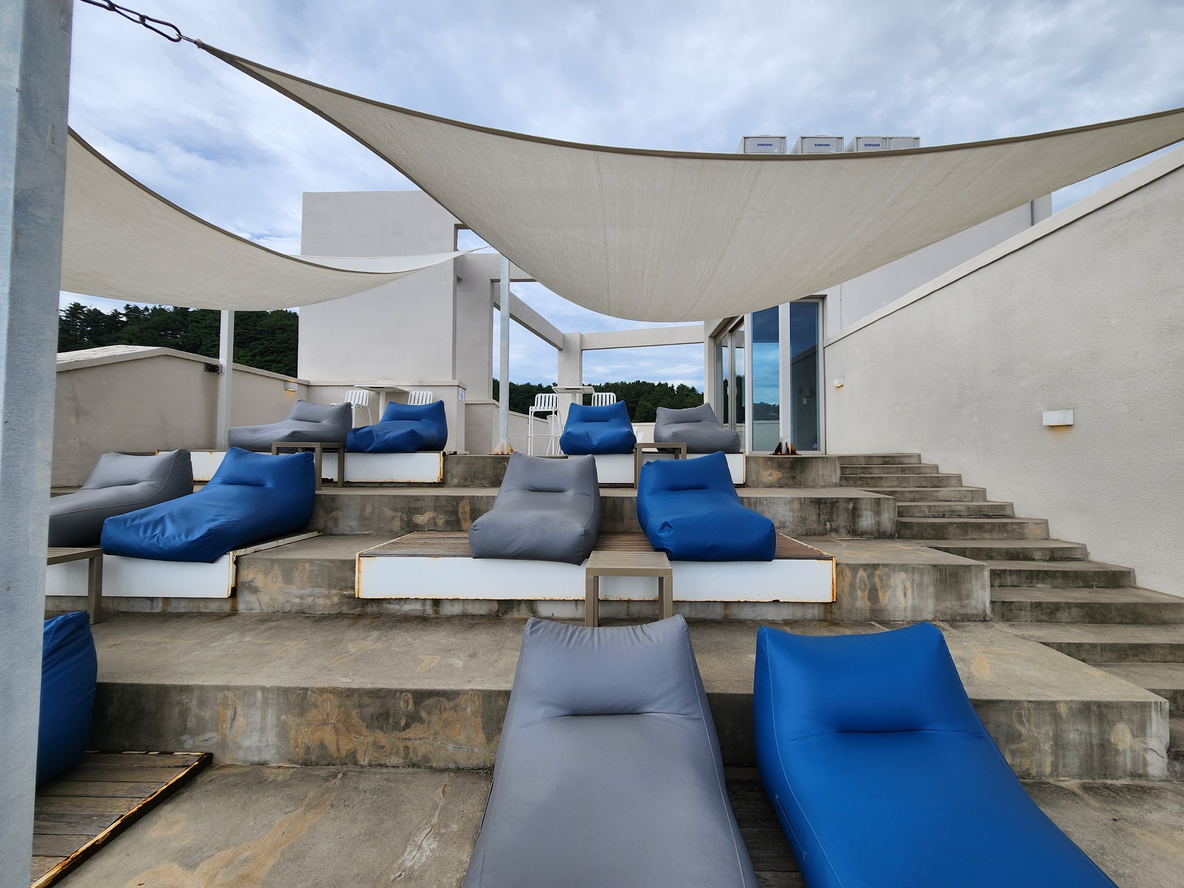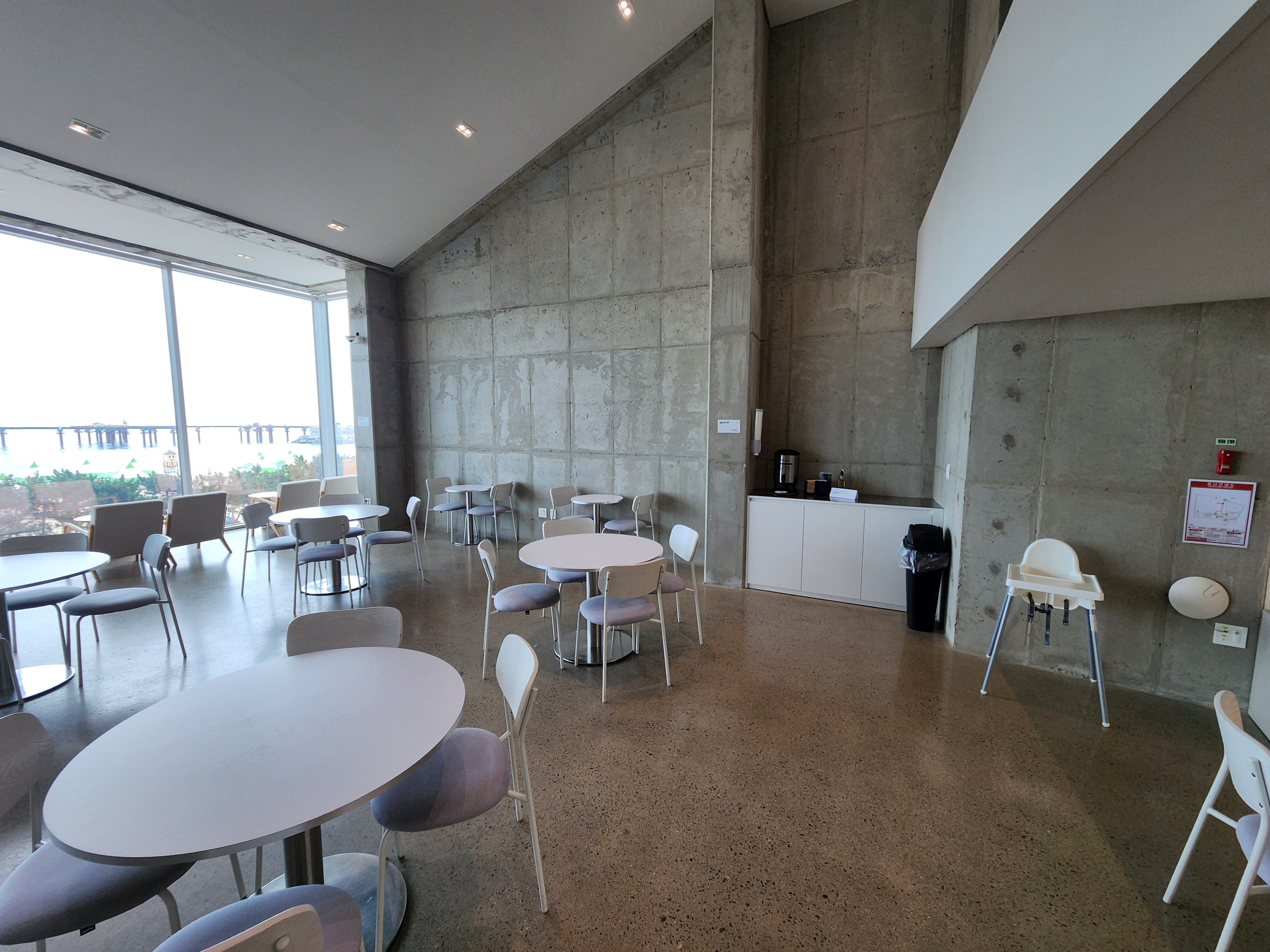 보사노바 삼척은 단순한 카페를 넘어, 공간 자체가 예술이에요. 알고 보니 실제로 건축 관련 디자인 어워드 수상 경력도 있더라고요. 각 층마다 분위기가 다른데, 1층은 펫룸(강아지 동반 가능!), 2~3층은 일반 좌석, 4층은 좌식 공간, 그리고 5층은 루프탑이에요.