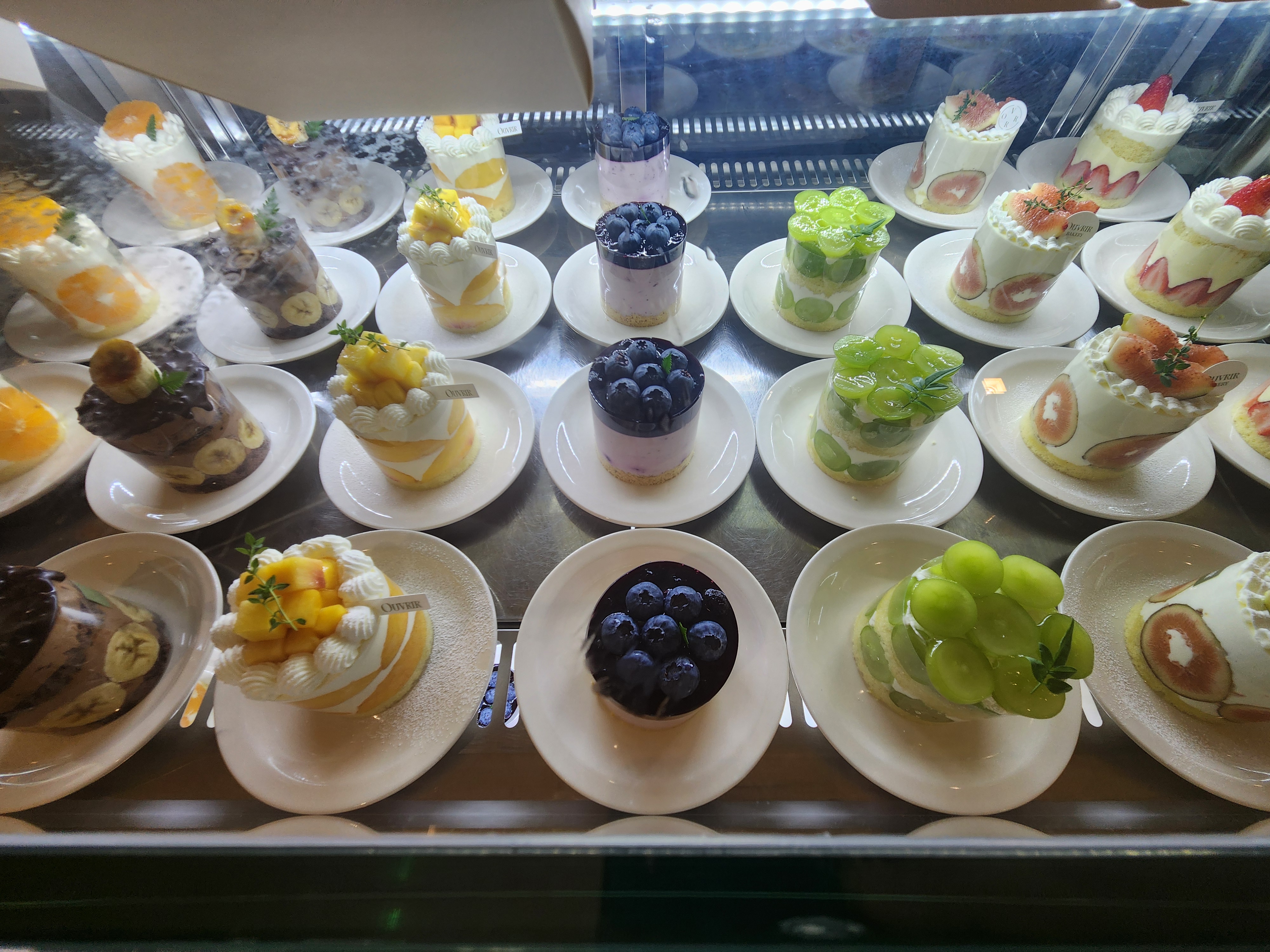 쇼케이스 안의 케이크들은 하나같이 예쁘고 단정한 비주얼이에요. 특히 프리지에 케이크는 시즌마다 올라가는 과일이 바뀌는데, 제철 과일로 만든 한정판 버전이 있었습니다.