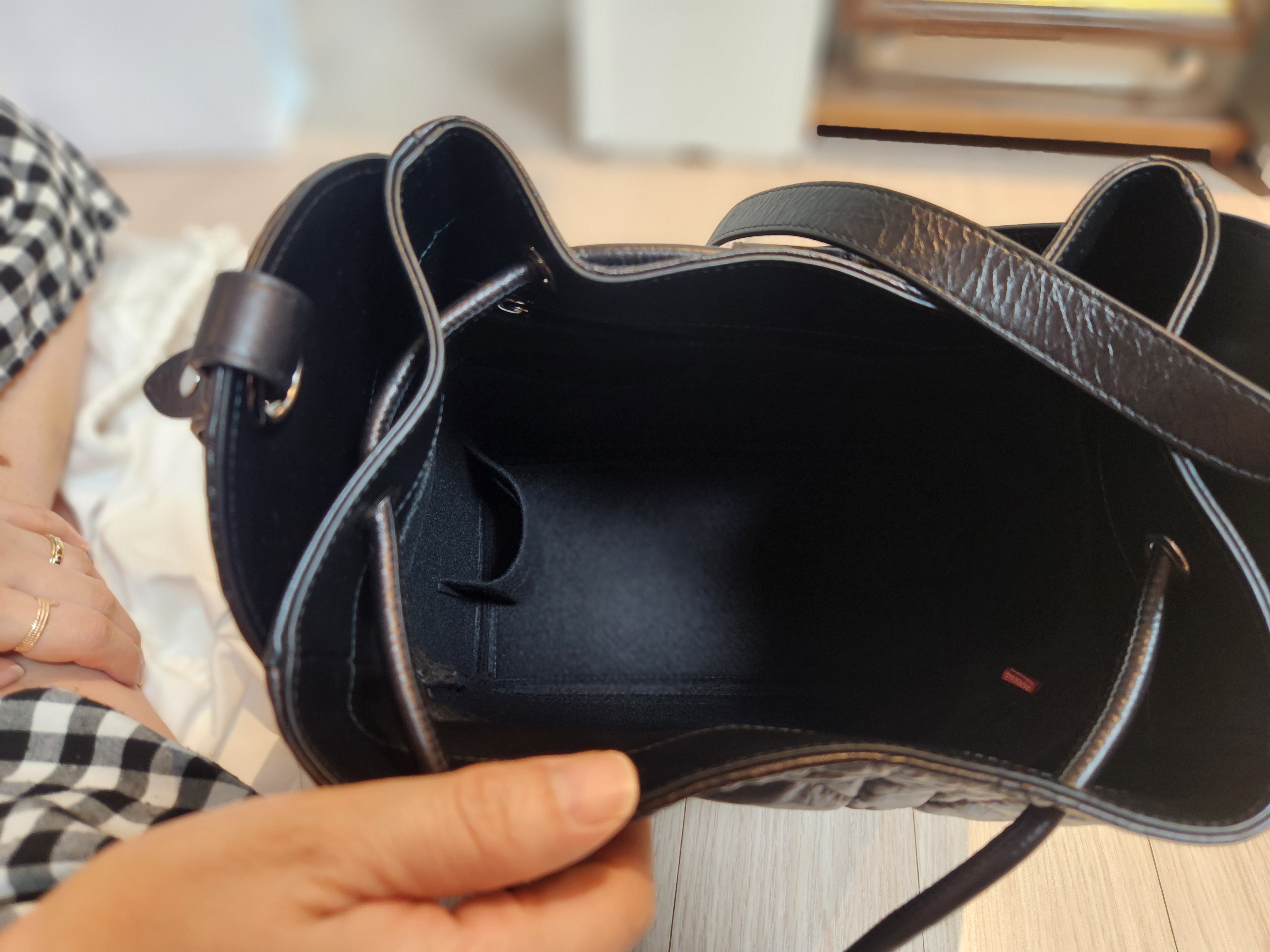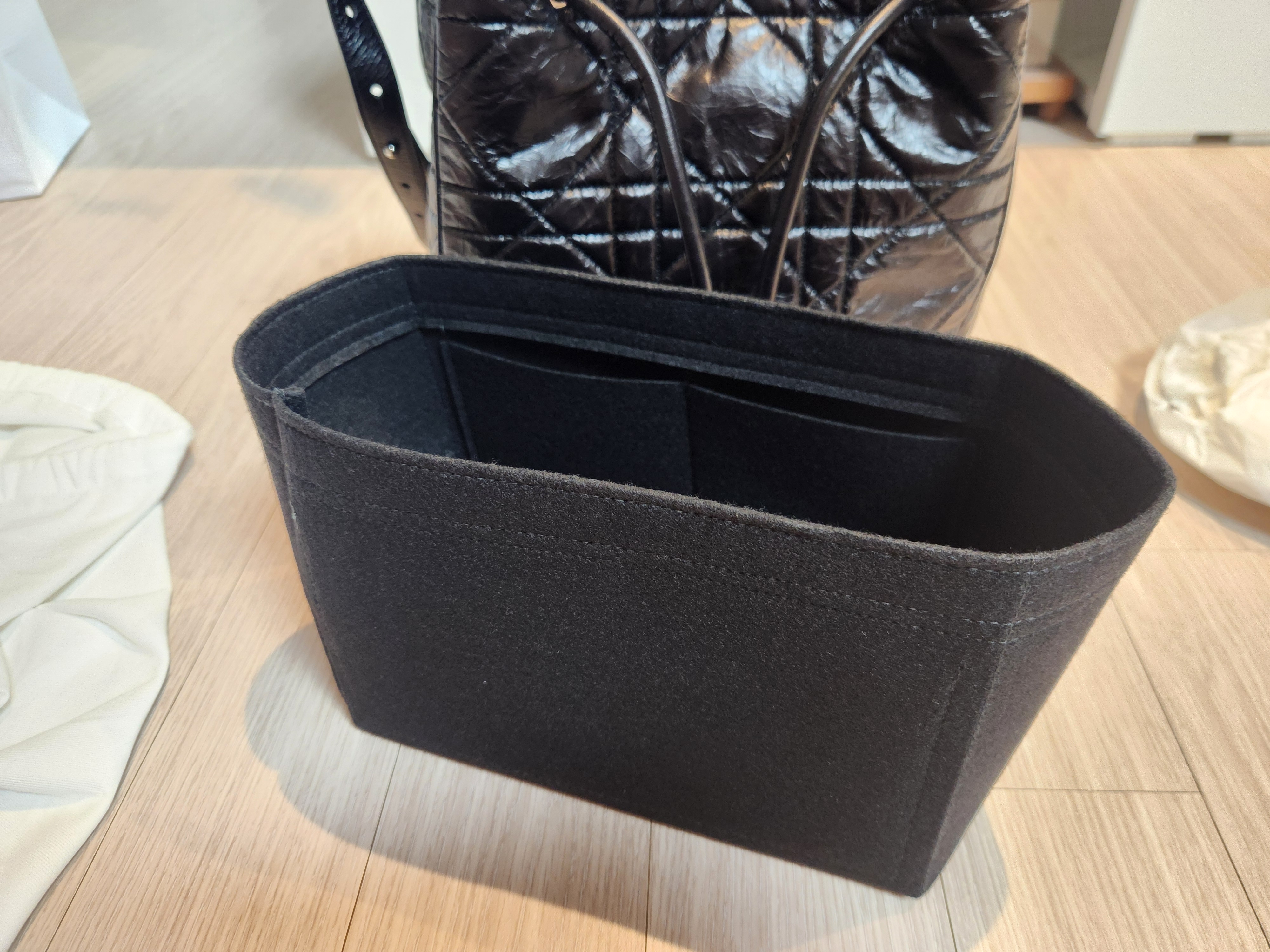 명품백의 단점 중 하나가 내부 스크래치나 오염에 민감하다는 점이잖아요. 그래서 저는 별도로 이너백을 바로 구매했습니다. 이너백을 넣으면 수납력이 좀 더 좋아지고, 내부가 지저분해지는 것도 방지할 수 있어요. 핸드폰, 장지갑, 화장품 몇 개, 차 키 정도는 넉넉하게 들어가서 생각보다 활용도가 높았습니다.