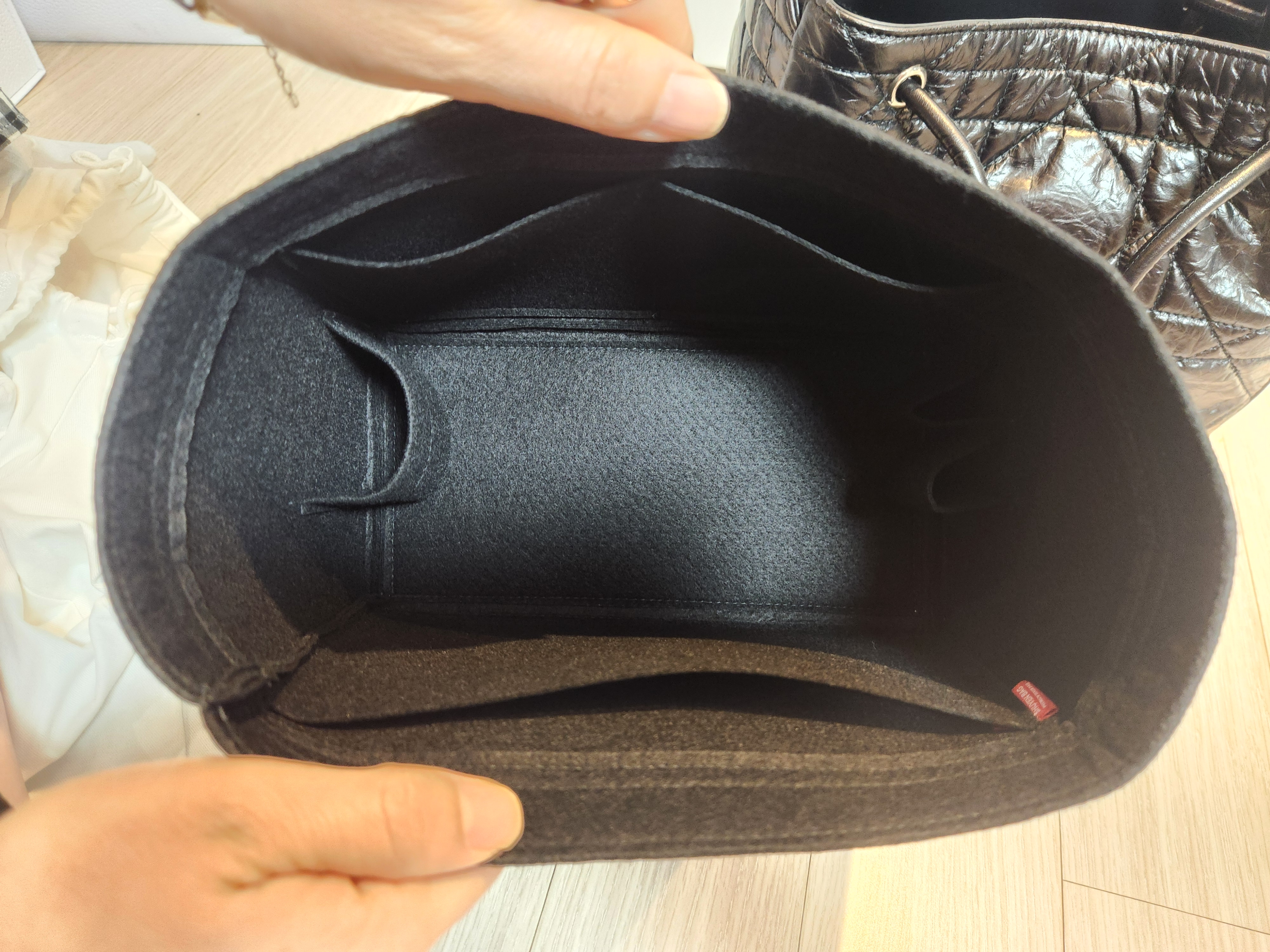 명품백의 단점 중 하나가 내부 스크래치나 오염에 민감하다는 점이잖아요. 그래서 저는 별도로 이너백을 바로 구매했습니다. 이너백을 넣으면 수납력이 좀 더 좋아지고, 내부가 지저분해지는 것도 방지할 수 있어요. 핸드폰, 장지갑, 화장품 몇 개, 차 키 정도는 넉넉하게 들어가서 생각보다 활용도가 높았습니다.