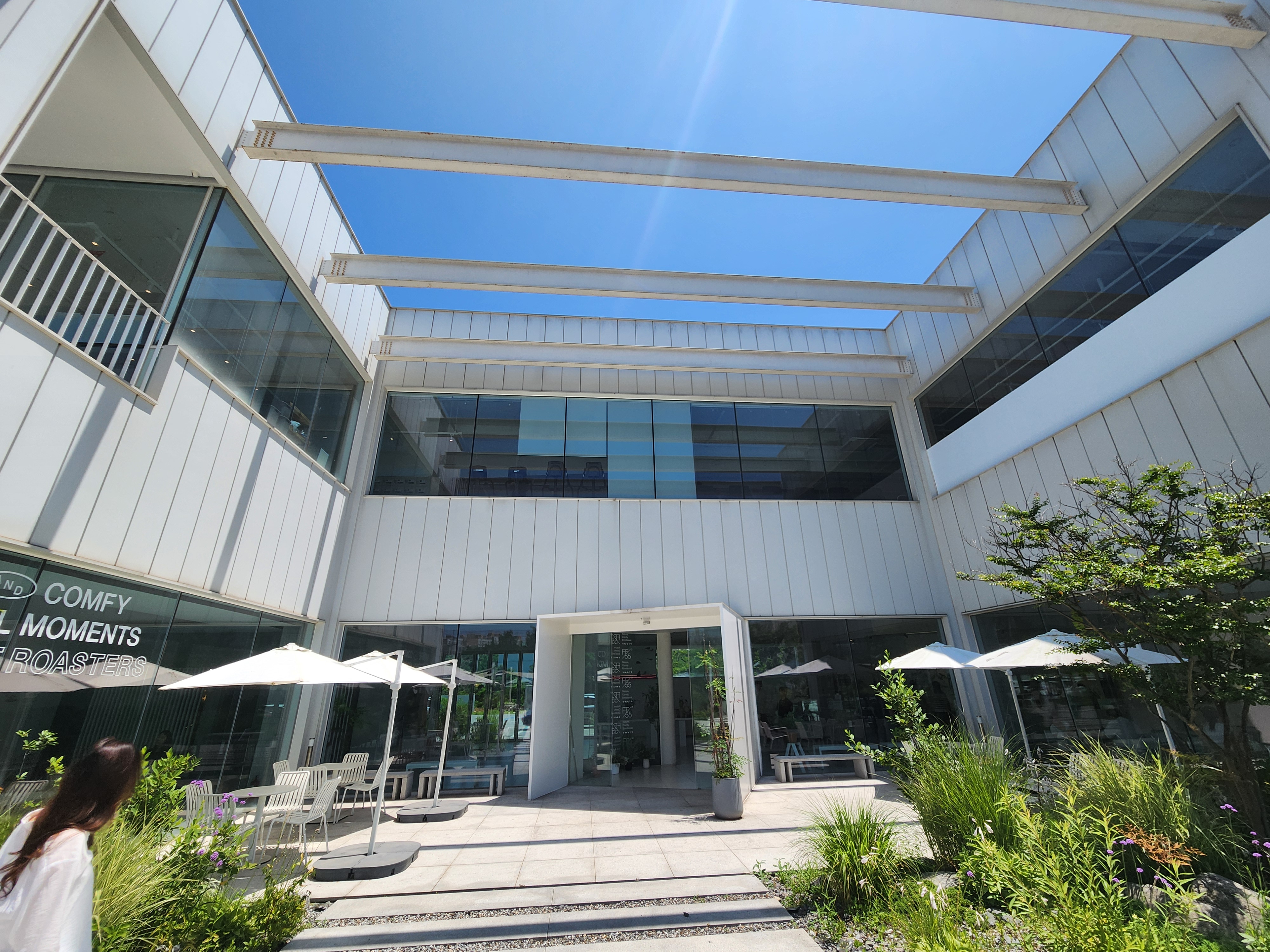 '55도'는 화이트 톤 단독건물에 대형 통유리창이 인상적이에요. 입구 앞에는 잔디가 깔린 정원도 있어서 사진 찍기에도 제격이고요.
