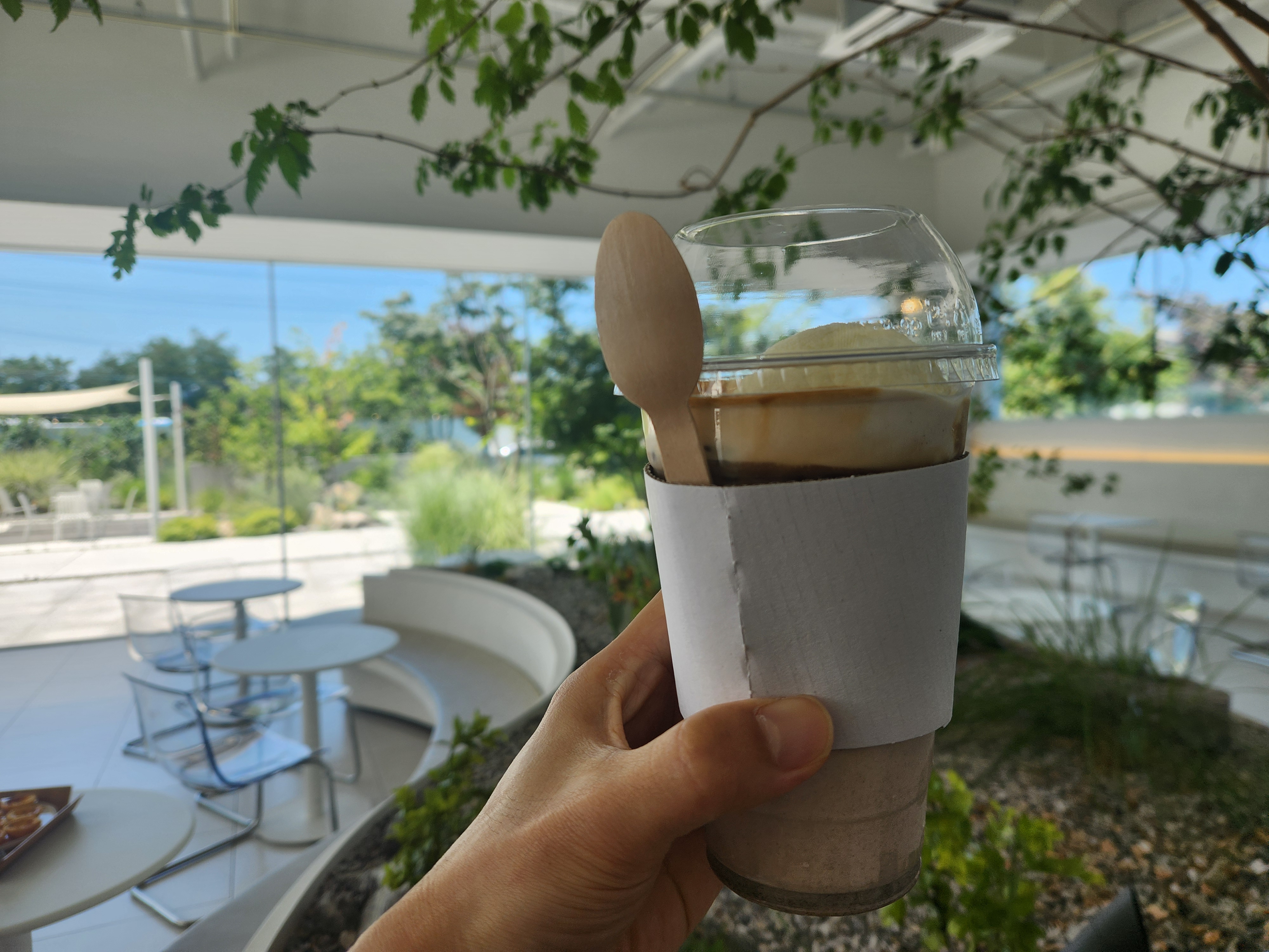 내부로 들어가면 높은 층고와 따뜻한 우드톤 + 화이트 인테리어가 딱 요즘 감성 카페 그 자체. 테이블 간격도 널찍해서 친구, 가족, 연인이든 누구와 와도 부담 없겠더라고요. 반려동물 동반도 가능하다고 들었어요. (단, 테라스 좌석 한정!)