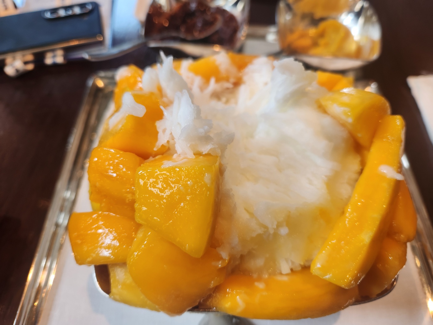 망고 위에는 황금빛 윤기가 흐르고, 결이 살아 있는 과육이 ‘이건 진짜 고급 과일이다!’ 라는 걸 말해주더라고요. 단순한 디저트라기보단 호텔 셰프가 예술혼을 담은 한 접시 같은 느낌. 사진 안 찍고는 못 배깁니다.
